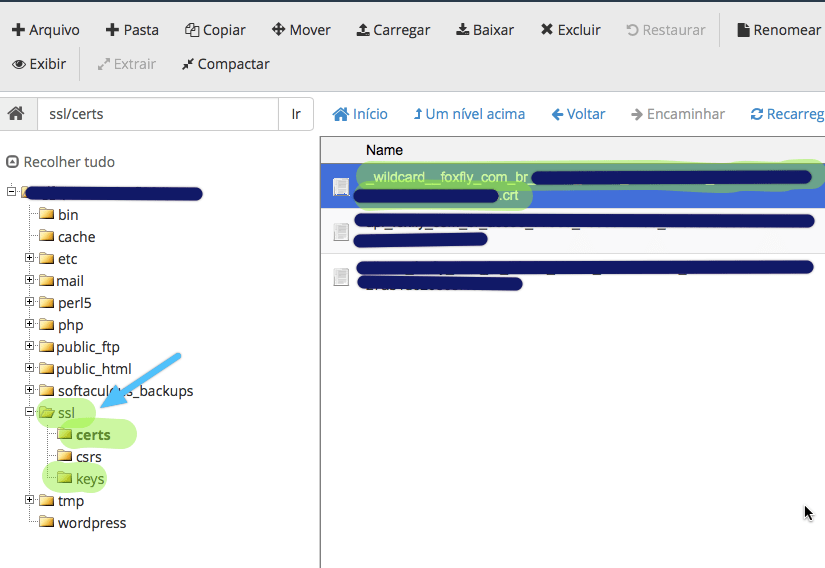 Você vai precisar dos arquivos .CRT (certificado) e .KEY (chave pública) para gerar o arquivo .PFX. A forma de acesso a eles vai depender de onde contratou o SSL. No nosso caso a contratação foi no Hostgator e os arquivos são colocados na pasta SSL no servidor.